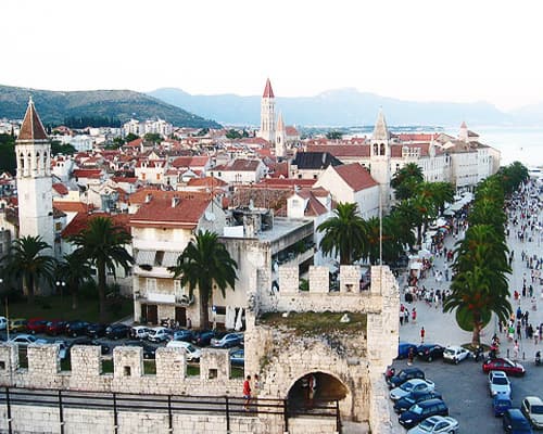 Trogir is a historic town and harbour on the Adriatic coast in Split-Dalmatia County, Croatia. The historic city of Trogir is situated on a small island between the Croatian mainland and the island of Čiovo. Since 1997, the historic centre of Trogir has been included in the UNESCO list of World Heritage Sites. Trogir is a jewel of a town encased in 15th-century walls. Tiny medieval streets wind through the enchanting town revealing hidden restaurants and eye-catching galleries. A wide seaside promenade snakes around the town, culminating in a charming port full of sailboats waiting to take you to the islands of Drvenik Mali and Drvenik Veli with their pristine sand beaches and secluded coves. The ancient ruins of the Roman city of Solin are also just a short drive away from Trogir and make an extraordinary day trip. About 3km from Trogir, on the island of Čiovo is a town called Okrug Gornji. It has 1km long beach with lots of bars right next to sea. The Kamerlengo Fortress, (at the waterfront). This 14. century fortress was build to control access to the harbor and the bay of Kastela.